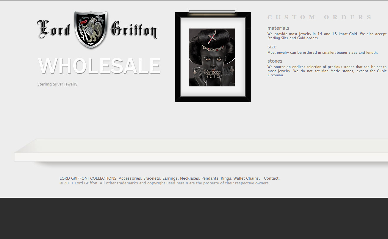 I helped create Lord Griffon, Inc. a clothing & jewelry company based in Los Angeles. My responsibilities included but were not limited to designing men & women jewelry collections. Supervising the creation of wax / metal masters and making CAD ready designs for production. Buying metal and gems. Attending trade shows, making presentations, line sheets, catalogs... Designed all logos, letterheads, business cards, invoices, well, pretty much everything design related as well as creating and maintaining the company website.